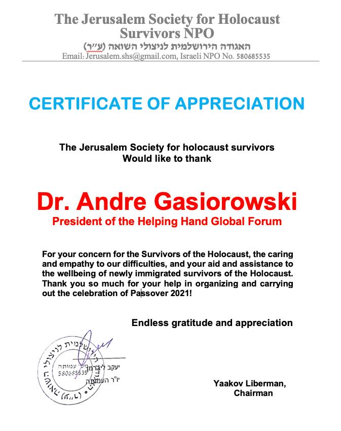 Поздравляем, от всех Департаментов и Конфедерации Женщин нашего Генерального Секретаря Международного Конгресса Содружество стран Мира, Д-ра Андре Гасиоровски, с высокой наградой от Иерусалимского Объединения Пострадавших в Катастрофе в период Великой Отечественной Войны, как знак благодарности за постоянно оказанную помощь всем, кто пострадал в Холокосте. Высокая значимость этого сильного и неординарного человека, умеющего творить добро для всех, кто нуждается в помощи!